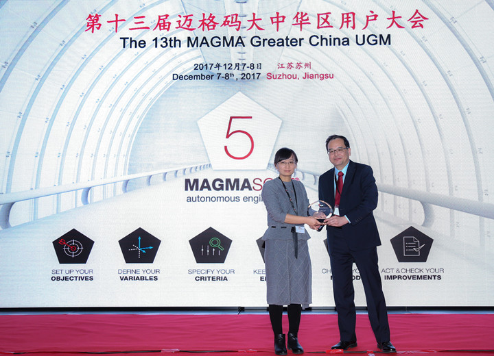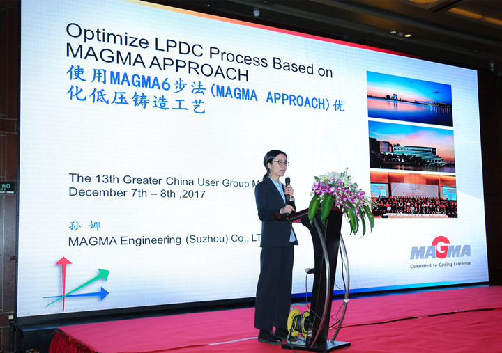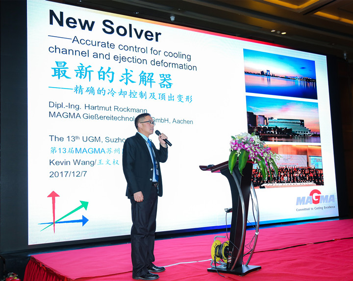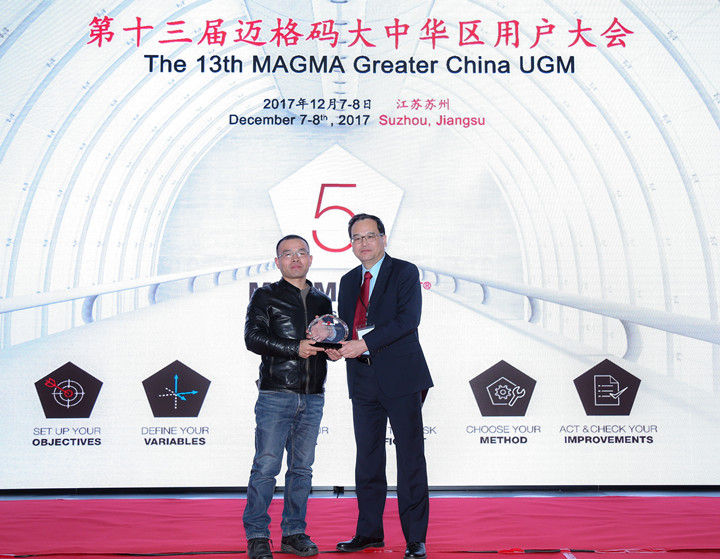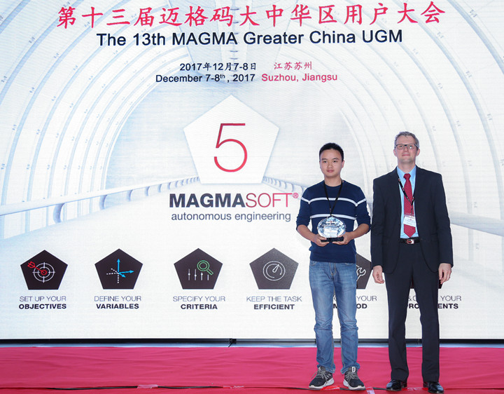 ![]() 全體人員合影 第十三屆邁格碼MAGMA大中華用戶(hù)大會(huì)在蘇州隆重舉行 初冬蘇州,寒風(fēng)徐來(lái)。2017年12月7-8日,第十三屆邁格碼大中華區(qū)用戶(hù)大會(huì)在蘇州中茵假日皇冠酒店隆重舉行。來(lái)自邁格碼亞洲總部(新加坡)總經(jīng)理趙望前博士、邁格碼(蘇州)軟件科技有限公司(下稱(chēng)“邁格碼中國(guó)”)總經(jīng)理馬修先生及全體員工、全國(guó)各地的MAGMASOFT用戶(hù)單位代表,以及專(zhuān)業(yè)媒體記者等近160人相聚一堂,共同分享和探討MAGMASOFT鑄造模擬分析軟件功能、應(yīng)用和優(yōu)化。 本屆大會(huì)的焦點(diǎn)是圍繞著“使用MAGMASOFT5 5.3版以及全新的5.4版的功能,開(kāi)發(fā)穩(wěn)健的工藝和優(yōu)化解決方案”而展開(kāi)。首日的會(huì)議,邁格碼中國(guó)的資深技術(shù)工程師,介紹MAGMASOFT采用6步法,即“設(shè)立目標(biāo)-定義變量-明確標(biāo)準(zhǔn)-提高效率-選定方案-實(shí)施決策”,去幫助鑄造生產(chǎn)開(kāi)發(fā)高效的工藝,以及得出完美的解決方案;而邁格碼的多家用戶(hù)單位也踴躍發(fā)言,帶來(lái)在鑄造行業(yè)各細(xì)分領(lǐng)域的應(yīng)用成果分享。