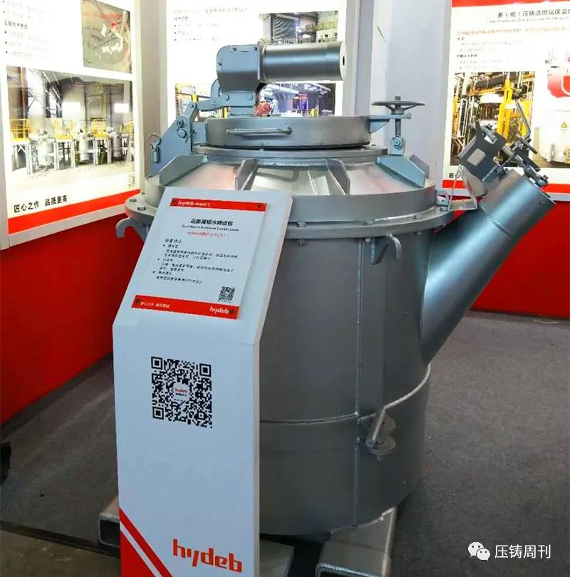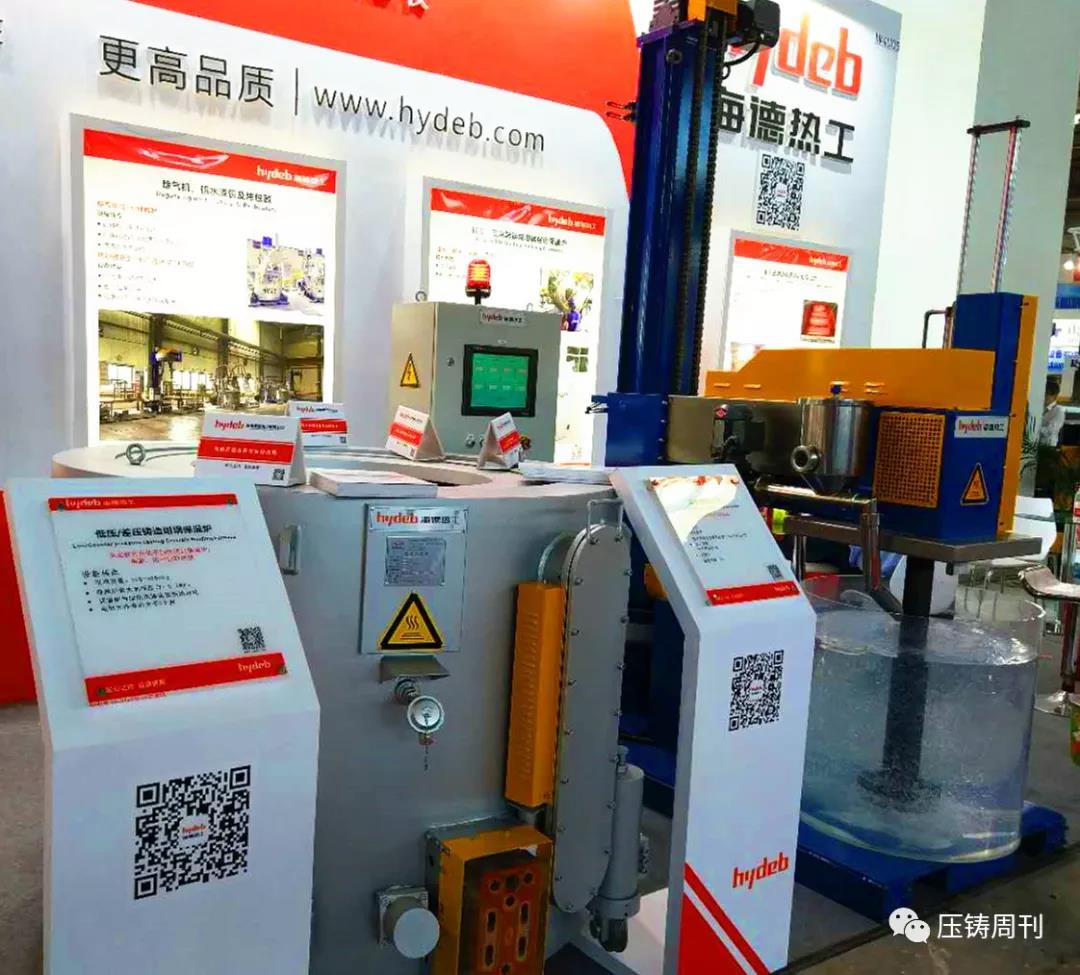 廣州德琺麒參展團隊(前排左二為廣州德琺麒總經(jīng)理蒲昌月先生) 本屆鑄博會上,廣州德琺麒主要推介工業(yè)4.0智能壓鑄單元示范工程,即為一套自動化、智能化、數(shù)字化的壓鑄島,配置鋁水供應(yīng)爐、恒溫淬火水箱、機器人仿型噴涂、機器人快速取件機、機器人取件視覺系統(tǒng)、料餅鋸切機、產(chǎn)品沖切整形機、通用去渣包機、機器人智能去毛刺,脫模劑自動配比回收機、模具油溫控制、模具點冷機、真空機,使用中央集成控制與反饋系統(tǒng)“串聯(lián)”成一個有機整體,并通過辦公室遠程監(jiān)控、云端遠程控制,組成一套自動化、智能化、數(shù)字化的壓鑄生產(chǎn)線。 海德熱工:展示高效熱能技術(shù)及解決方案 濟南海德熱工有限公司專注于鋁合金鑄造的熱能設(shè)備研發(fā)和制造。本屆展會上,海德熱工攜鋁水精煉除氣機、遠程鋁水轉(zhuǎn)運包、低壓(差壓)鑄造坩堝保溫爐三款產(chǎn)品亮相展會,向國內(nèi)外專業(yè)買家,展示其在鋁液轉(zhuǎn)運、熔煉保溫、精煉除氣的最新技術(shù)及應(yīng)用解決方案。