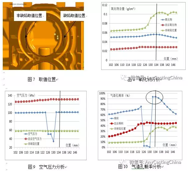 通過Anycasting鑄造模擬軟件計算,得出兩種方案氧化物含量云圖和空氣壓力云圖,如右圖所示,利用單一的判斷依據無法進行氣渣孔缺陷的判斷。需考慮氣體和氧化物共同作用下的分析計算。 1.3.2模擬結果取值分析 如圖7進行缺陷位置和非缺陷位置的氧化物含量取值,得出如圖8所示的氧化物含量曲線圖。如圖7進行缺陷位置和非缺陷位置的空氣壓力取值,得出如圖9所示的空氣壓力曲線圖。按照組合缺陷參數方法如下公式,進行計算: 氣渣孔概率=K[(氧化物含量)n x b(空氣壓力)m]x100% 通過數據放大擬合得出如圖9的氣渣孔概率曲線。明顯可以看出缺陷位置氣渣孔概率高達90%以上,與生產實際氣渣孔缺陷發(fā)生情況一致。非缺陷位置雖然氧化物含量高,但是氣渣孔概率低于40%,與實際生產一致。更改澆道方案雖然空氣壓力高,但是氣渣孔概率低于40%,與實際生產一致。