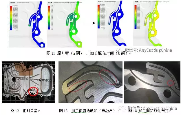 1.4判定方法驗證 選擇成熟正時罩蓋產品進行判定方法驗證,首先用現(xiàn)有工藝進行模擬。得出如圖11a的空氣壓力和氧化物含量云圖。發(fā)現(xiàn)圖示位置有卷氣大于2個大氣壓,氧化物含量在0.03~0.04g/cm3。對比方案為將低速充填時間加長,使氧化物含量增加。得到如圖11b的空氣壓力和氧化物云圖。因為充填時間加長,鋁液卷氣減少,圖示位置氣體壓力減少到1個大氣壓左右。鋁液與空氣接觸時間加長,氧化物含量增加到0.05~0.06g/cm3。通過按照上述判定方法取值計算以及實際生產參數調整驗證(如圖14、15),預測缺陷位置與實際缺陷位置一致。