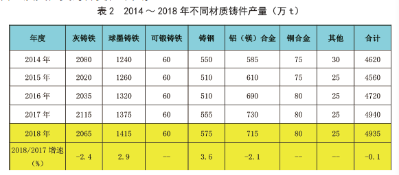 從不同材質鑄件產量來看(見表2),灰鑄鐵2017年產量2115萬噸,2018年2065萬噸,下降2.4 %;受離心鑄鐵管的拉動,球墨鑄鐵(包括蠕墨鑄鐵)從1375萬噸增長到1415萬噸,增幅2.9%;受軌道交通、礦冶重機、工程機械等行業的帶動,鑄鋼件產量繼續保持增長,增速為3.6%;受汽車以及摩托車產量下降的影響,鋁(鎂)合金鑄件首次出現負增長,降幅為2.1%;可鍛鑄鐵、銅合金及其他類鑄件變化不大。