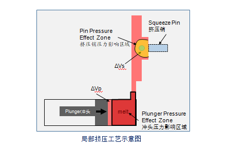 全新功能:局部擠壓縮松 隨著壓鑄件集成化程度越來越高,壓鑄產品也越來越復雜,壓鑄工藝不再局限于生產壁厚均勻的產品。圖示鑄件厚大位置區域,沖頭壓力不能有效傳遞到該位置,所以需要增設局部擠壓銷來解決該位置可能存在的縮松問題。其中黃色區域為該擠壓銷的影響區域。AnyCastingV6.6版本中的局部擠壓功能能夠綜合考慮擠壓銷壓力,擠壓銷運動速度,擠壓延遲時間、擠壓銷作用時間等因素來綜合判定局部擠壓對鑄件厚大位置縮松缺陷的影響。