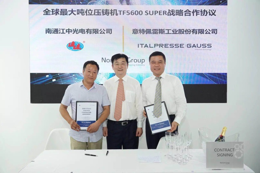 AR Table 在中國壓鑄展首日,南通江中光電有限公司與諾瑞肯集團成功簽約目前全球最大噸位的意特佩雷斯高壓壓鑄機TF 5600 SUPER以及戰略合作協議。這款首臺新型TF 5600 SUPER是目前全球最大噸位的兩板機。江中光電經理郭垂宏先生、諾瑞肯亞太區高級副總裁魏寶華先生,在現場觀眾與各家媒體的見證下于諾瑞肯展臺現場成功簽約。更有沈陽鑄造研究所有限公司董事長婁延春先生親臨見證這一高光時刻。 南通江中光電有限公司創辦于1992年,擁有國際先進壓鑄設備生產線和金屬加工設備,是電梯扶梯行業鋁合金配件最全的廠商之一。目前工廠中有3臺意特佩雷斯高斯3300噸的高壓壓鑄機,是諾瑞肯集團的忠實用戶。迄今為止,TF系列中最大的機型合模力可達5600噸,這款截至當下全球最大噸位的TF 5600 SUPER預計明年將落地中國市場。