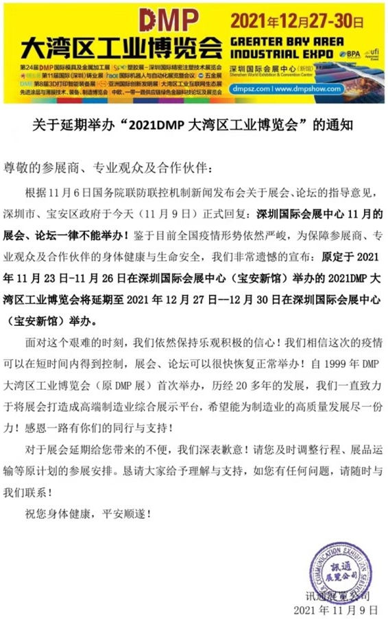 鑒于目前全國疫情形勢依然嚴峻,原定于2021年11月23日—11月26日在深圳國際會展中心(寶安新館)舉辦的2021第十一屆國際(深圳)鑄業(yè)展 & DMP大灣區(qū)工業(yè)博覽會將延期至2021年12月27日—12月30日在深圳國際會展中心(寶安新館)舉辦。具體通知如下: