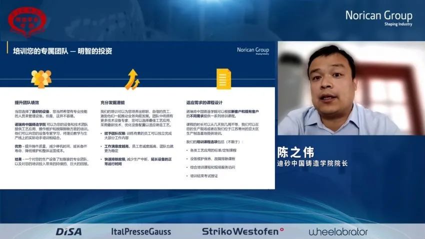 諾瑞肯以此次授牌為契機,也將進一步加大旗下迪砂鑄造學院培訓基地的建設。迪砂中國鑄造學院正式成立于2017年,學院能夠為客戶的設備和技術(shù)團隊提供工藝應用、操作維護和故障排除方面的培訓,將理論教學與生產(chǎn)線上的實際動手培訓相結(jié)合。迪砂中國鑄造學院可以根據(jù)客戶的不同需求提供一系列培訓課程。目前,學院開設的課程包括,設備維護專業(yè)培訓、工藝應用提升培訓等。同時還舉辦專場研討交流會,每年為鑄造行業(yè)培訓高端技術(shù)人才近千人。今后,迪砂鑄造學院會在相關(guān)政府部門與行業(yè)協(xié)會的領(lǐng)導和指導下,加強上下游產(chǎn)業(yè)鏈的資源整合,突出企業(yè)在全球領(lǐng)先高端鑄造設備方面的生產(chǎn)、研發(fā)、銷售、服務優(yōu)勢,努力把培訓基地打造成一個管理創(chuàng)新、技術(shù)創(chuàng)新、人才創(chuàng)新的智慧平臺。