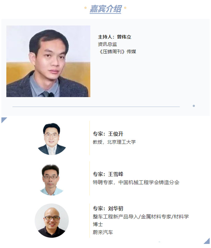 汽車鑄造俱樂部系列活動往期回顧 目前俱樂部已成功舉辦兩次線下活動及兩次線上直播,百余位汽車及壓鑄行業專家已借此平臺進行高效交流,溝通前瞻技術及行業發展最關心的熱點話題。 ? 線下活動 “汽車鑄造俱樂部”分別在上海、重慶舉辦了線下活動,百余位來自蔚來、上汽、通用、華人運通、一汽、恒大、博世、舍弗勒等汽車行業專家、有色鑄造領域及其他跨行業人士參加了活動,并對活動給予了高度的認可與贊揚,表示對俱樂部的未來發展充滿期待。 ? 線上活動 “汽車鑄造俱樂部”啟動的“對話大型一體化壓鑄”線上研討系列專題活動。2022年4月28日首次線上直播聚焦高端模具制造,第二期直播于2022年5月20日帶來合金材料研發及應用專場。兩場直播均邀請了知名企業及單位,從多角度深度探討熱點話題,吸引近萬名觀眾在線觀看,直播互動氣氛熱烈,為行業帶來了精彩的內容呈現。