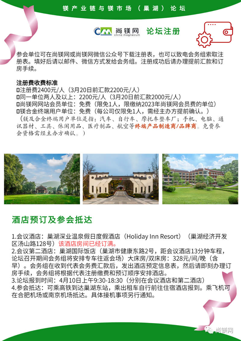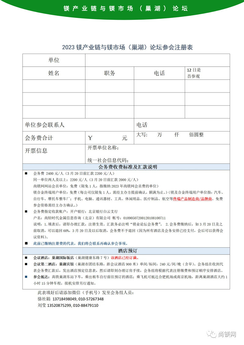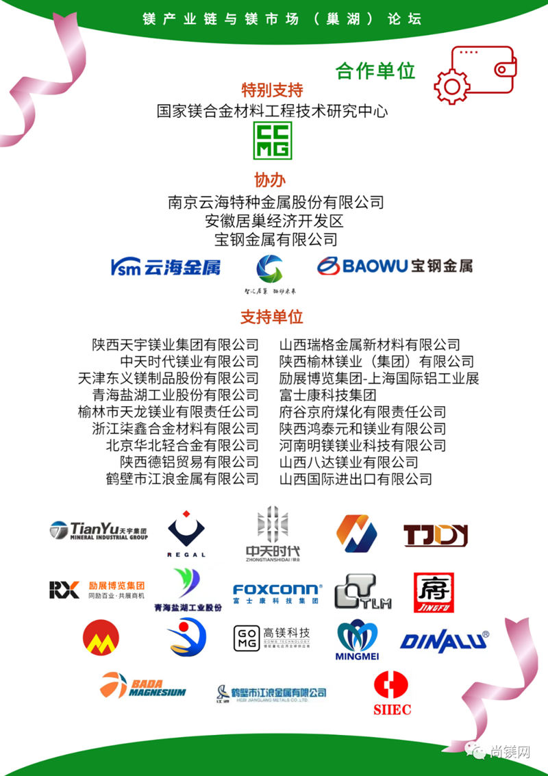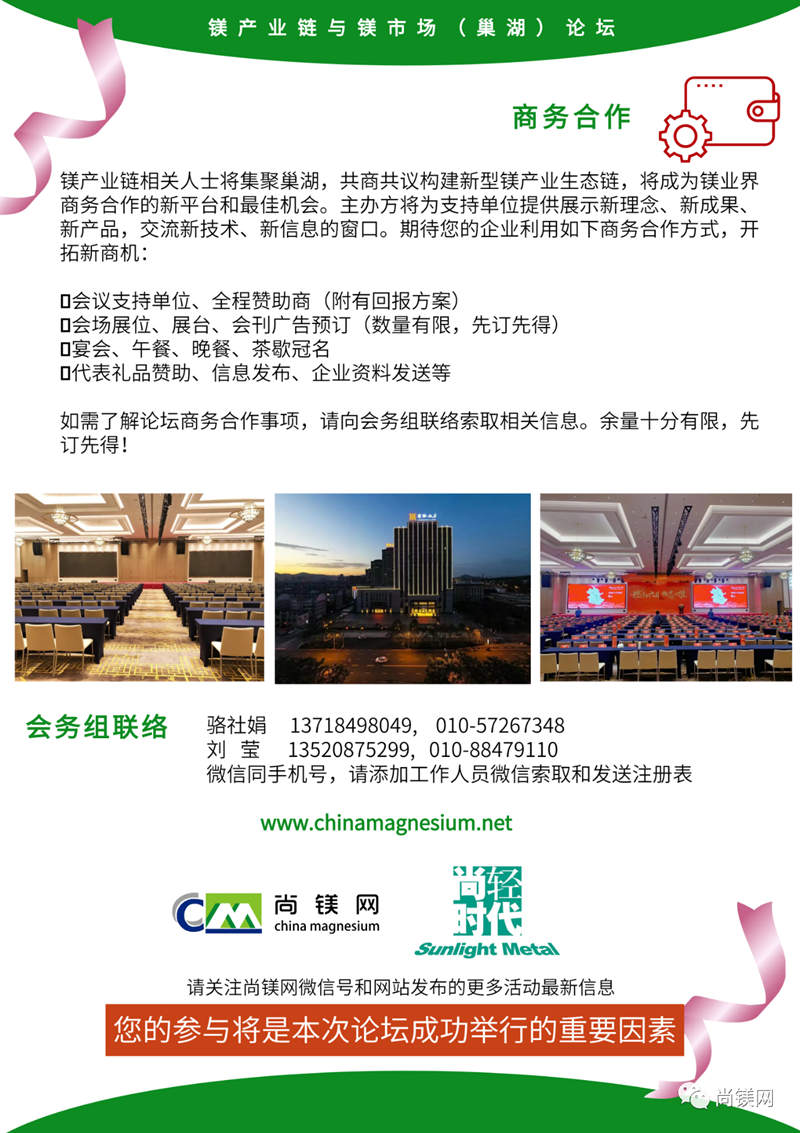 鎂產(chǎn)業(yè)鏈相關(guān)人士將集聚巢湖,共商共議構(gòu)建新型鎂產(chǎn)業(yè)生態(tài)鏈,將成為鎂業(yè)界商務(wù)合作的新平臺(tái)和最佳機(jī)會(huì)。主辦方將為支持單位提供展示新理念、新成果、新產(chǎn)品,交流新技術(shù)、新信息的窗口。期待您的企業(yè)利用如下商務(wù)合作方式,開拓新商機(jī): 如需了解論壇商務(wù)合作事項(xiàng),請(qǐng)向會(huì)務(wù)組聯(lián)絡(luò)索取相關(guān)信息。余量十分有限,先訂先得! 截止3月14日,僅余3個(gè)會(huì)場(chǎng)展位待訂,虛位以待! 會(huì)議注冊(cè):