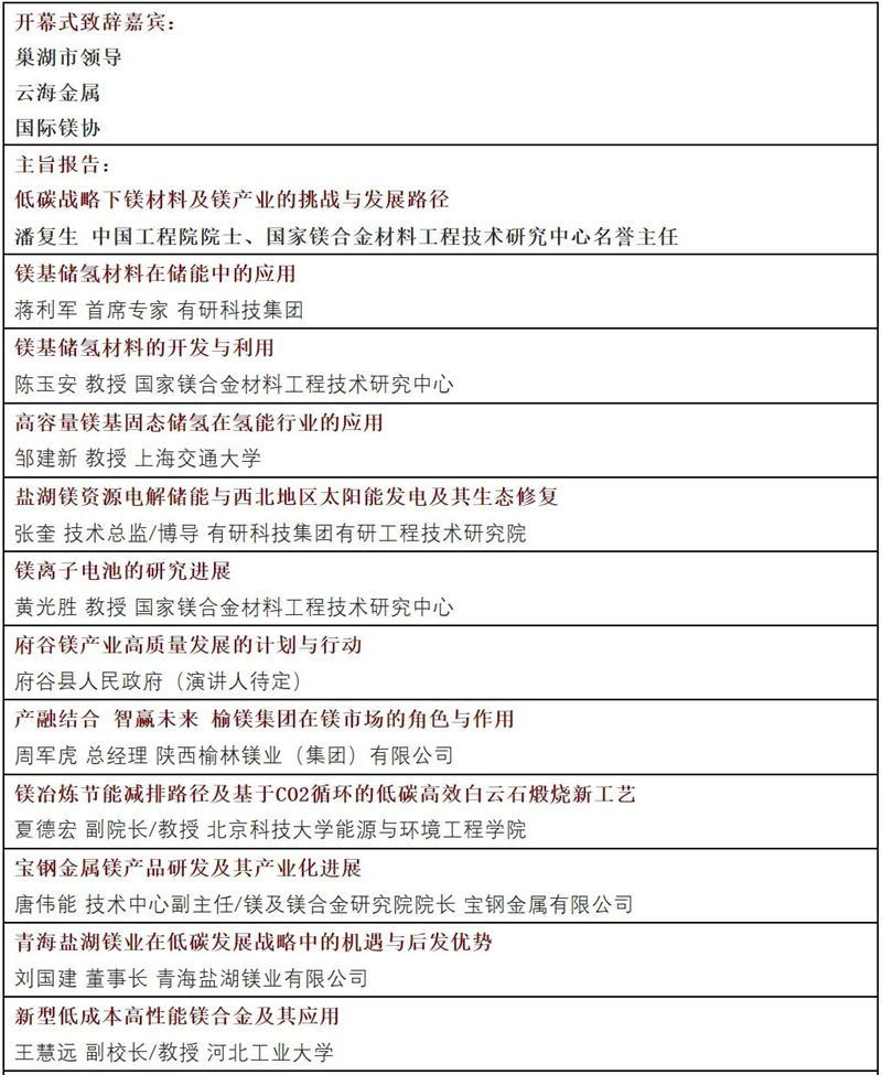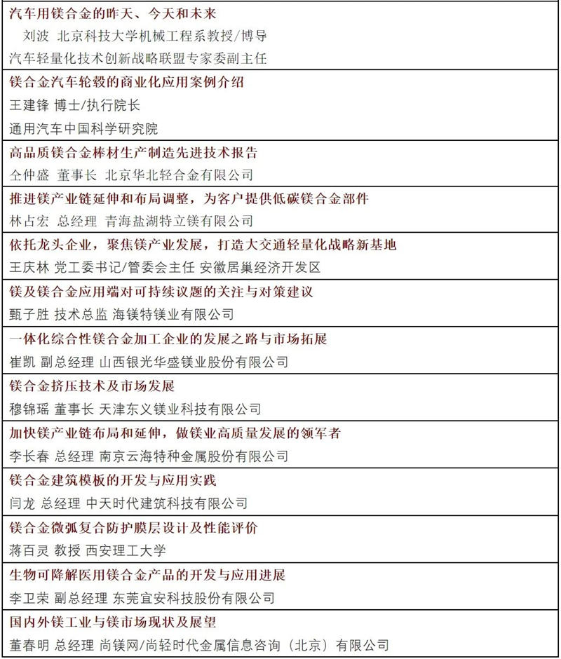 演講嘉賓、題目、順序如有變化,以現(xiàn)場(chǎng)安排為準(zhǔn) 參觀活動(dòng): 參觀:巢湖云海鎂業(yè)、宜安云海科技、寶鋼金屬寶瑪克科技、居巢經(jīng)濟(jì)開發(fā)區(qū) 巢湖云海鎂業(yè)是云海金屬全資子公司,宜安云海科技是宜安科技與云海金屬的合資公司,以這兩家企業(yè)為主導(dǎo),已經(jīng)在巢湖建成白云石開采-原鎂冶煉(豎式還原爐)-冶煉廢渣綜合利用-廢鎂回收-鎂合金熔煉-鎂合金零部件精深加工完整的鎂產(chǎn)業(yè)鏈。是全球單體規(guī)模最大最集約化的鎂合金材料和深加工一體化生產(chǎn)基地。本次將安排與會(huì)代表參觀該公司先進(jìn)的原鎂冶煉、鎂合金熔煉、鎂鋁合金壓鑄及機(jī)加工、表面處理生產(chǎn)線、公司展廳。 寶瑪克科技是寶鋼金屬的控股子公司,總部位于巢湖。公司聚焦發(fā)展鋼、鋁、鎂相結(jié)合的系列化輕量化部件產(chǎn)品,力爭(zhēng)成為規(guī)模制造并擁有知名品牌的輕量化部件供應(yīng)商,成為鋼鋁鎂輕量化綜合解決方案的領(lǐng)軍者。公司具備鋼制車身件、鋁制下車身件、鋼鋁側(cè)圍等產(chǎn)品的同步設(shè)計(jì)研發(fā)能力,并投入批量生產(chǎn),主要產(chǎn)品有鋼制輥壓型材、鎂合金擠壓件、鋁合金擠壓件及汽車零部件總裝產(chǎn)品。公司正在巢湖打造有全國(guó)影響力的大交通輕量化項(xiàng)目,寶瑪克科技巢湖輕量化項(xiàng)目一期已投產(chǎn),一期二步已開工建設(shè)。 邀請(qǐng)參會(huì)人員:
