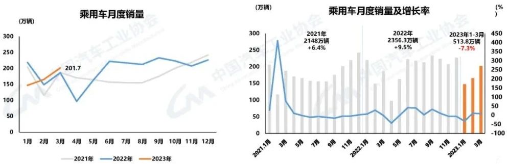 乘用車產銷較快增長 3月,乘用車產銷分別完成214.9萬輛和201.7萬輛,環比分別增長25.3%和22%,同比分別增長14.3%和8.2%。1-3月,乘用車產銷分別完成526.2萬輛和513.8萬輛,同比分別下降4.3%和7.3%。