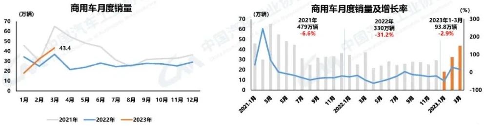 商用車產銷同比環比雙增長 3月,商用車產銷均完成43.4萬輛,環比分別增長37.1%和34.2%,同比分別增長20.4%和17.4%。商用車繼續延續了2月的產銷同比、環比雙增長的態勢。1-3月,商用車產銷分別完成94.8萬輛和93.8萬輛,同比分別下降3.9%和2.9%。