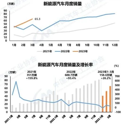 新能源汽車產銷同比持續增長 3月,新能源汽車產銷分別完成67.4萬輛和65.3萬輛,同比分別增長44.8%和34.8%,市場占有率達到26.6%。1-3月,新能源汽車產銷分別完成165萬輛和158.6萬輛,同比分別增長27.7%和26.2%,市場占有率達到26.1%。