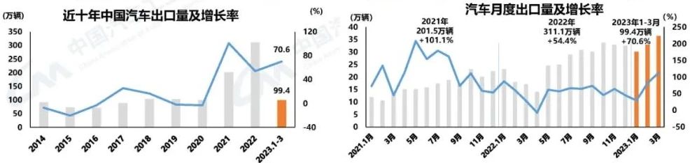 汽車出口持續迅猛增長 3月,汽車企業出口36.4萬輛,環比增長10.6%,同比增長1.1倍。汽車出口延續了去年強勢出口的態勢,今年以來增速不斷攀升。1-3月,汽車企業出口99.4萬輛,同比增長70.6%。