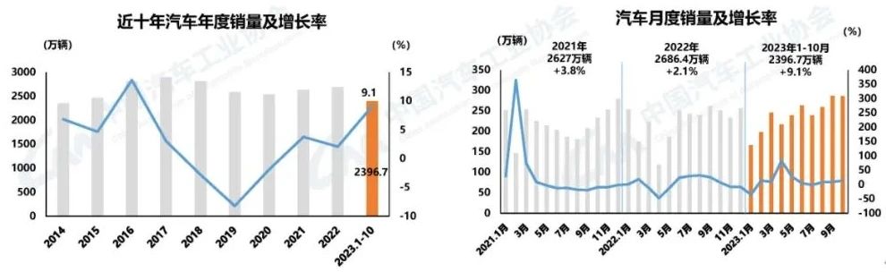 1-10月,我國汽車產銷分別完成2401.6萬輛和2396.7萬輛,同比分別增長8%和9.1%。其中,乘用車產銷分別完成2073.1萬輛和2066.4萬輛,同比分別增長6%和7.5%;商用車產銷分別完成328.6萬輛和330.3萬輛,同比分別增長22.1%和19.8%;新能源汽車產銷完成735.2萬輛和728萬輛,同比分別增長33.9%和37.8%,市場占有率達到30.4%。