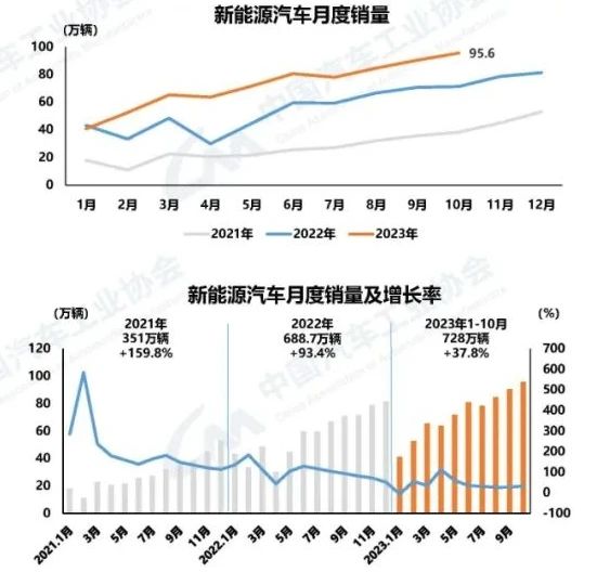 ![]() 近日(11月10日),中國汽車工業協會(簡稱:中汽協)發布10月汽車產銷數據及經濟運行情況。據中汽協統計分析,2023年10月,進入金秋十月,多地車展與促銷活動火熱進行,各大車企新車型持續發布,進店客流顯著增加,進一步拉動汽車消費。 2023年10月,我國汽車產銷分別完成289.1萬輛和285.3萬輛,同比分別增長11.2%和13.8%。汽車產銷繼9月后再創當月歷史同期新高。其中,乘用車產銷分別完成251.3萬輛和248.8萬輛,同比分別增長7.6%和11.4%;商用車產銷分別完成37.8萬輛和36.5萬輛,同比分別增長42.7%和33.4%;新能源汽車產銷分別完成98.9萬輛和95.6萬輛,同比分別增長29.2%和33.5%,市場占有率達到33.5%。