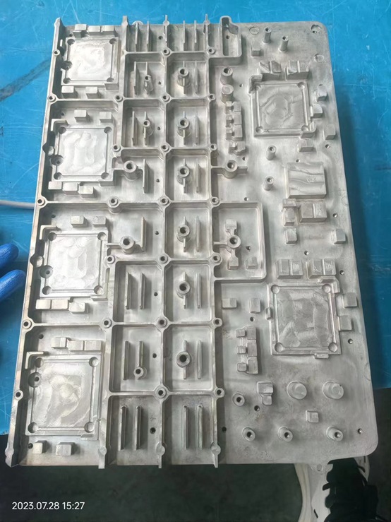 新能源電動汽車電控箱殼體整套成功的壓鑄模具開發(fā)是集材料、熱處理、模具設計、壓鑄工藝、加工、裝配工藝、管理、品控等多項技術(shù)系統(tǒng)整合及運用,是一個龐大的系統(tǒng)工程。其中壓鑄工藝方案設計是非常重要的一環(huán),工藝的合理性直接影響鑄件的質(zhì)量和后續(xù)生產(chǎn)加工環(huán)節(jié)。電控箱殼體結(jié)構(gòu)復雜,內(nèi)部質(zhì)量要求高。如螺紋加工不允許有爛牙、氣孔率要求≤2%等。對此類復雜型壓鑄件,良好的壓鑄工藝設計方案對產(chǎn)品的質(zhì)量起著決定性作用。 針對難點公司采取澆排系統(tǒng)設計與抽真空方案,壓鑄模具在高溫高壓環(huán)境下工作,對模具材料和抗熱疲勞性能要求高,而且結(jié)構(gòu)復雜、壁厚相差大,并要求通過高壓下的滲漏試驗,因此鑄造中產(chǎn)生的能夠?qū)е滦孤┑臍饪s孔、粘模等缺陷是首先需要規(guī)避的。選擇符合壓鑄工藝要求澆排系統(tǒng),特別是內(nèi)澆口位置和導向,應使金屬液流動平穩(wěn)順暢,并有序的排除型腔內(nèi)氣體,以達到良好的填充效果和避免壓鑄缺陷產(chǎn)生的目的。通過對產(chǎn)品的結(jié)構(gòu)及性能要求分析,進行澆排設計。首先采用鑄造仿真軟件對產(chǎn)品的澆注和排溢系統(tǒng)進行充填、粒子追蹤、氣壓、溫度、凝固等過程的數(shù)值模擬分析,其次根據(jù)分析結(jié)果來確認方案設計的合理性,最終通過生產(chǎn)試驗進行工藝設計方案的合理性驗證。 鑒賞鑄件二 鑄件名稱:水冷板
