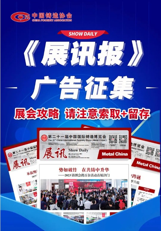 ![]() 各鑄造相關(guān)企業(yè): “第二十二屆中國國際鑄造博覽會”“第十七屆中國國際壓鑄工業(yè)展覽會”“第十七屆國際有色及特種鑄造展覽會”將于2024年7月4-7日在國家會展中心(上海)舉辦。作為“鑄博會”展期主辦報(bào)刊,《展訊》聚焦展期重要信息、匯集會展活動資訊、展示展商魅力風(fēng)采、指引觀眾便捷觀展,在展期面向所有展商和觀眾發(fā)行,是便于各方聯(lián)絡(luò)與對接必不可少的展期指南,更是人手一份不能錯過的觀展攻略。