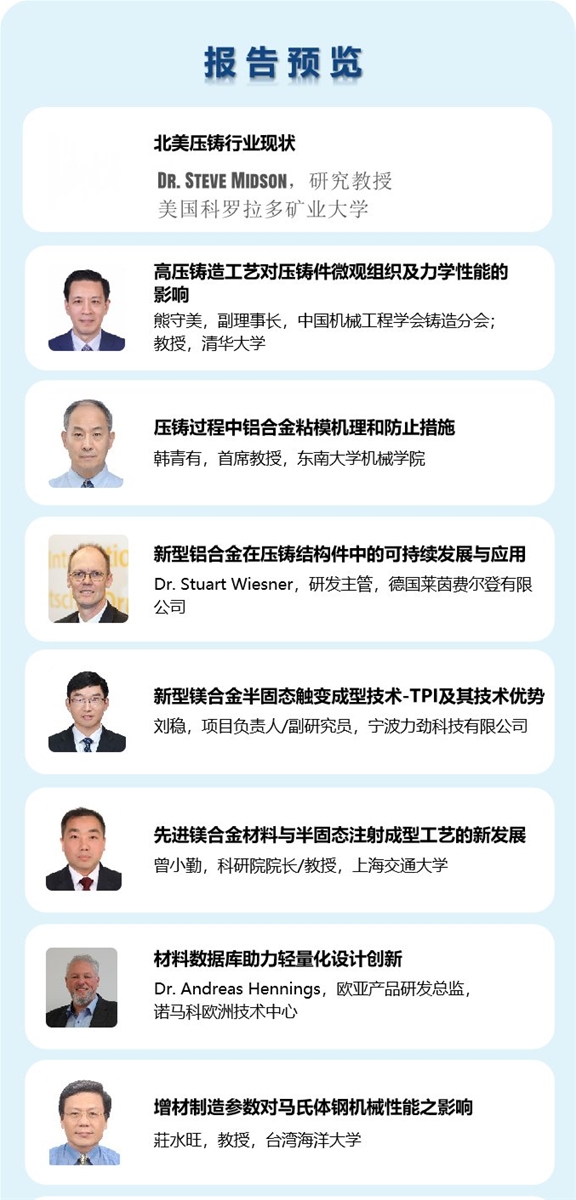 除了邀請來自中國大陸、中國香港、中國臺灣的行業專家作報告外,大會還將著重邀請國際知名專家共同探討全球壓鑄技術、工藝、材料及行業趨勢等話題。其中,美國科羅拉多礦業大學教授Dr. Steve Midson將以《北美壓鑄行業現狀》為題作報告;德國萊茵費爾登有限公司研發主管Dr. Stuart Wiesner將以《新型鋁合金在壓鑄結構件中的可持續發展與應用》為題作報告。 主會場:技術報告