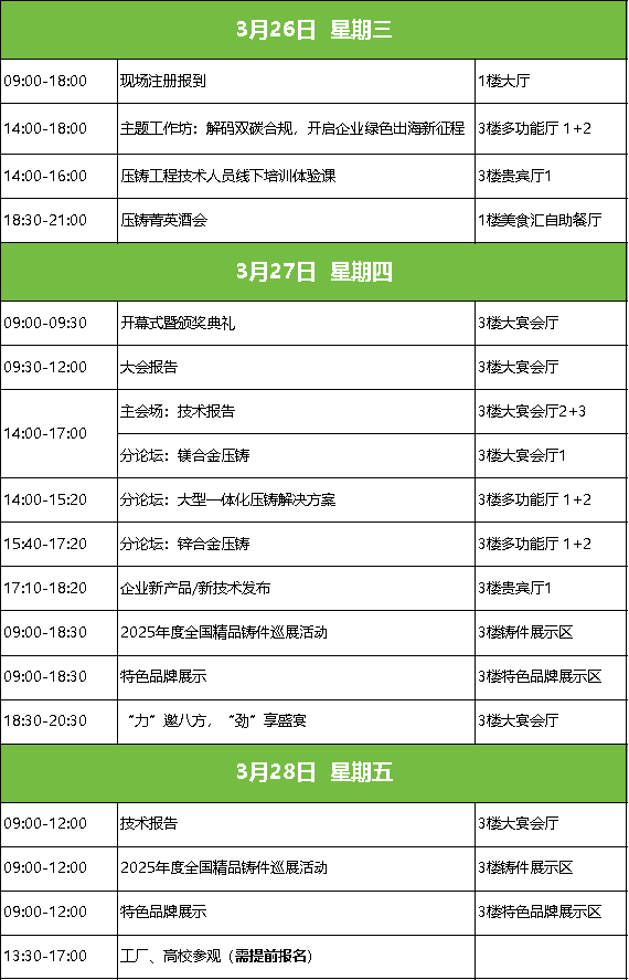 享受優惠價工廠參觀,每條線路名額有限,先到先得 2025年度全國精品鑄件巡展活動 ■ 一汽鑄造有限公司 ■ GF成型方案 ■ 諾瑪科(南京)汽車零部件有限公司 ■ 布雷博(南京)汽車零部件有限公司 ■ 寶武鎂業科技股份有限公司 ……