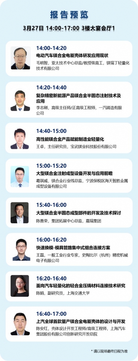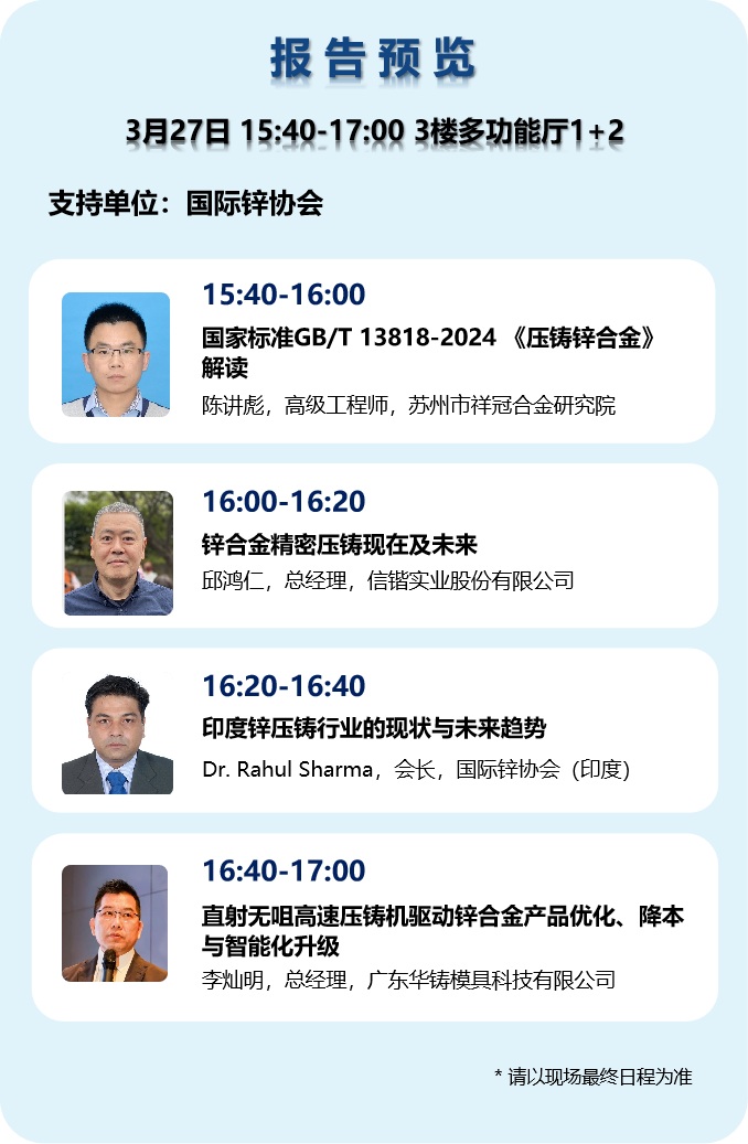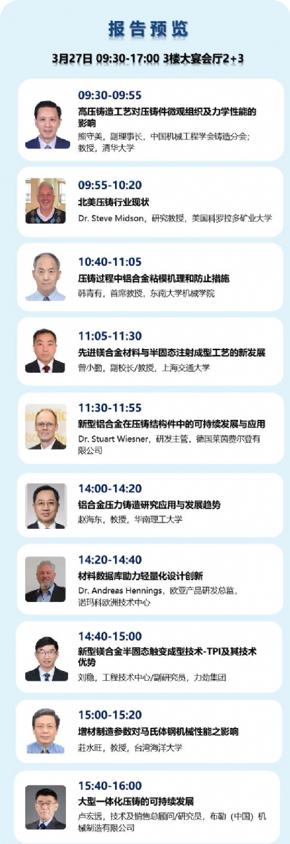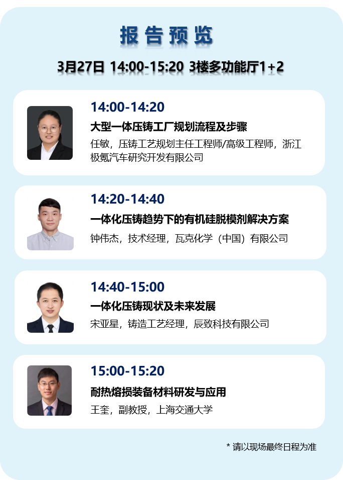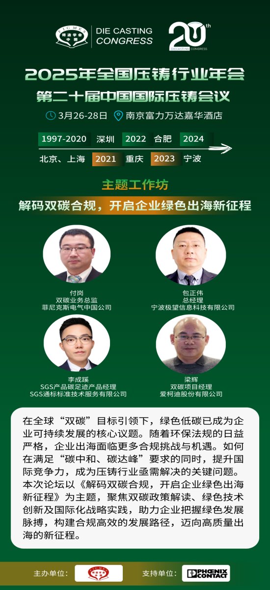 ![]() 2025年全國壓鑄行業年會—第二十屆中國國際壓鑄會議將于3月26-28日在南京富力萬達嘉華酒店舉辦,旨在匯聚全球學術界、企業界、車廠等各方力量,搭建一個高端對話與合作的平臺。會議以“鏈動全球壓鑄”為目標,與全球壓鑄同仁一起剖析壓鑄行業最新發展趨勢,探討競爭格局,為行業未來發展提前布局、科學規劃提供一些思路。誠邀壓鑄同仁蒞臨參會! 活動一覽表