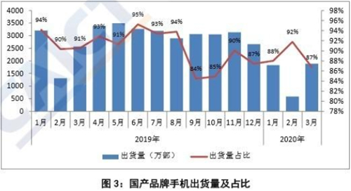 在國內手機市場國內外品牌構成方面,2020年3月,國產品牌手機出貨量1887.5萬部,同比下降26.5%,占同期手機出貨量的86.8%。1-3月,國產品牌手機出貨量4305.2萬部,同比下降39.2%,占同期手機出貨量的87.9%。 |