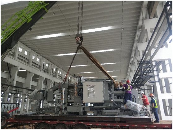 8月15日,首批生產設備進場。圖為1000T壓鑄機吊裝。
