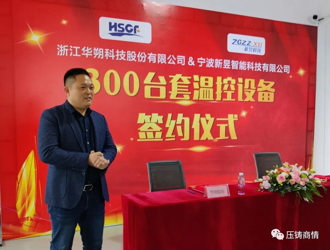 華朔股份CEO沈善忠先生、新昱科技總經(jīng)理王蘇華先生分別在簽約本上簽字 在活動(dòng)現(xiàn)場(chǎng),浙江華朔科技股份有限公司CEO沈善忠先生、寧波新昱智能科技有限公司總經(jīng)理王蘇華先生分別致辭,并在簽約本上簽字。根據(jù)協(xié)議,華朔股份向新昱科技采購(gòu)300臺(tái)套壓鑄溫控設(shè)備,并于未來(lái)三年每年采購(gòu)數(shù)百臺(tái)溫控設(shè)備,用于新上壓鑄單元及原有壓鑄生產(chǎn)線的設(shè)備升級(jí)改造。