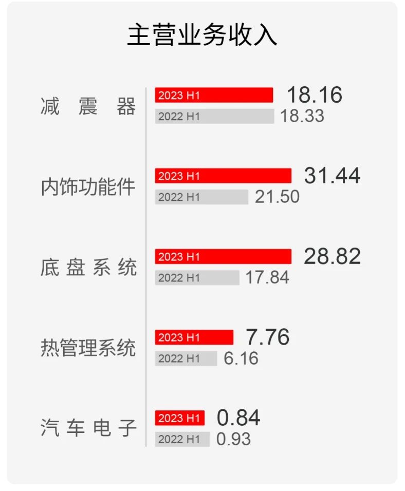 報(bào)告顯示,拓普集團(tuán)主營(yíng)業(yè)務(wù)為汽車零部件的研發(fā)、生產(chǎn)及銷售,主要產(chǎn)品包括汽車 NVH 減震系統(tǒng)、內(nèi)外飾系統(tǒng)、輕量化車身、智能座艙部件、熱管理系統(tǒng)、底盤系統(tǒng)、空氣懸架系統(tǒng)、智能駕駛系統(tǒng)共八大業(yè)務(wù)板塊。上半年公司主營(yíng)業(yè)務(wù)國(guó)內(nèi)的營(yíng)業(yè)收入為58.08億元,同比增長(zhǎng)33.84%;國(guó)外的營(yíng)業(yè)收入為28.95億元,同比增長(zhǎng)35.42%。在主營(yíng)業(yè)務(wù)中,減震器營(yíng)收18.16億元,內(nèi)飾功能件營(yíng)收31.44億元,底盤系統(tǒng)營(yíng)收28.82億元,汽車電子營(yíng)收8380.07萬(wàn)元,熱管理系統(tǒng)營(yíng)收7.76億元。