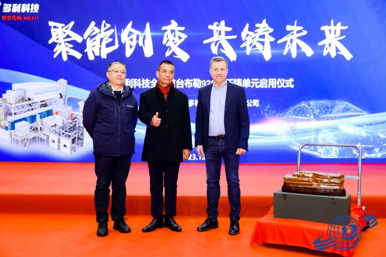 ![]() 瑞雪兆豐年!工廠外雪花飄飄,車間里熱鬧非凡。2023年12月18日下午,多利科技全球首臺布勒9200T壓鑄單元啟用儀式在多利鹽城工廠隆重舉行。這是繼6100T壓鑄單元之后,多利科技第二套超大型壓鑄單元正式投入生產。