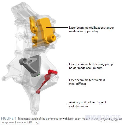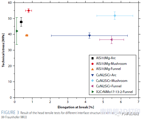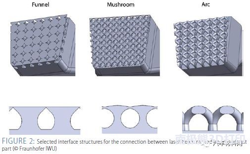 ![]() 圖1 激光熔化(Laser Beam Melting-LBM)和激光金屬粉末沉積技術(shù)(Laser Metal Deposition-LMD)具有可生產(chǎn)復(fù)雜形狀部件的優(yōu)勢(shì),特別適用于復(fù)雜零部件的小批量生產(chǎn)。近年來(lái),其在航空航天、醫(yī)療、汽車(chē)等領(lǐng)域有了越來(lái)越多的應(yīng)用。盡管如此,增材制造由于生產(chǎn)時(shí)間相對(duì)較長(zhǎng),生產(chǎn)成本較高,仍然很難實(shí)現(xiàn)工業(yè)生產(chǎn)。 與增材制造相比,壓鑄工藝可在短時(shí)間內(nèi)生產(chǎn)出大批量的產(chǎn)品。得益于高達(dá)12米/秒的填充速度,壓鑄部件的生產(chǎn)周期每個(gè)組件僅需幾分鐘就可完成。然而,擁有高生產(chǎn)效率的同時(shí)也有一些缺點(diǎn):如,高復(fù)雜程度的部件不能成型較難,且往往需要更為精細(xì)的模具。生產(chǎn)過(guò)程高機(jī)械強(qiáng)度、熔體的沖擊磨損以及較大的溫度波動(dòng)都導(dǎo)致壓鑄模具較為昂貴。此外,一個(gè)模具一般只能生產(chǎn)一種形狀的零件。 作為Agent-3D聯(lián)合項(xiàng)目的一部分,由德國(guó)聯(lián)邦教育和研究部資助的CastAutoGen項(xiàng)目致力于將增材制造與壓鑄工藝相結(jié)合,形成混合工藝鏈,更好的發(fā)揮這兩種工藝的優(yōu)勢(shì)。工藝路線的設(shè)計(jì)充分考慮生產(chǎn)周期和成本因素,將簡(jiǎn)單的大體積結(jié)構(gòu)區(qū)域采用壓鑄工藝制造,高功能化和復(fù)雜程度較高的部件區(qū)域采用二者相結(jié)合的工藝。基于此設(shè)計(jì)了兩套工藝方案:方案1研究了將附加插入和裝配到單一模具中;方案2研究了如何通過(guò)LMD在單一壓鑄構(gòu)件上創(chuàng)建附加結(jié)構(gòu)。 1模具中附加零件的制造 方案1研究了利用激光束熔化技術(shù)實(shí)現(xiàn)復(fù)雜結(jié)構(gòu)壓鑄成形工藝。該方案中,加強(qiáng)筋、熱交換器、支架等結(jié)構(gòu)通過(guò)激光束熔化制造,然后插入模具,再這些部件周?chē)_(kāi)始鑄造。具體如圖1。該方案還研究了不同幾何形狀的界面改性技術(shù),以達(dá)到更好的結(jié)合性。 研究者針對(duì)汽車(chē)輔助單元支架的壓鑄模具進(jìn)行改進(jìn),使得插件能模塊化的容納在模具中。在激光熔融工藝的設(shè)計(jì)和開(kāi)發(fā)中,需特別注意連接區(qū)域結(jié)合界面的幾何形狀和表面修飾。因此,研究了如圖2所示的三種界面結(jié)構(gòu)的連接機(jī)械性能,拉伸試驗(yàn)結(jié)果如圖3所示。