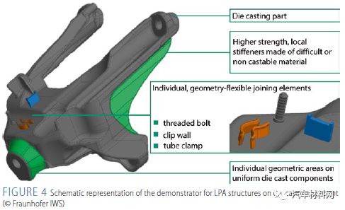 2在壓鑄結(jié)構(gòu)中添加附加件 方案2研究了在鑄造部件上通過(guò)激光金屬粉末沉積技術(shù)(LDP)和焊接工藝實(shí)現(xiàn)附加部件的技術(shù)方案。與方案1不同,方案2是以壓鑄件為基礎(chǔ)(如圖4中灰色部分),采用LPD技術(shù)制造附加結(jié)構(gòu),并通過(guò)焊接實(shí)現(xiàn)結(jié)合。