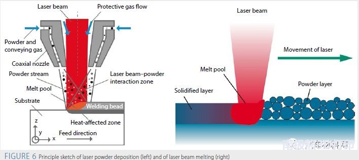 激光粉末沉積(LDP)是通過(guò)借助于聚焦激光束局部熔化基板表面將金屬或陶瓷填充材料以粉末形式焊接到金屬基板上的過(guò)程。如圖6(左)所示,填充材料首先通過(guò)吸收激光束能量熔化,然后再?gòu)娜鄢匚諢崃亢笸耆刍T撨^(guò)程需在保護(hù)性氣體氣氛下進(jìn)行,以避免發(fā)生不需要的化學(xué)反應(yīng)。熔體通過(guò)散熱進(jìn)入部件而固化,形成焊珠。多個(gè)焊珠的堆疊形成整個(gè)三維結(jié)構(gòu)。適合的材料有鋼、鎳、鈷、鋁、銅、鈦等。 在激光束熔化中,如圖6(右)所示,組件是由粉末分層堆疊而成的。將組件的CAD文件分層導(dǎo)入系統(tǒng)后,在限定高度將粉末層施加在基板上,激光束在惰性氣體氣氛中掃描粉末床表面,在對(duì)應(yīng)的點(diǎn)熔化,進(jìn)而固化。然后再施加下一層,直至整個(gè)部件完成,最后將部件移出。