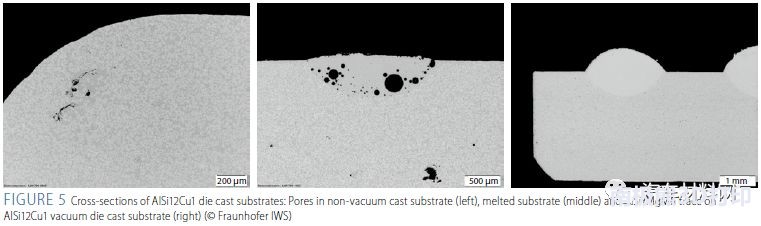 從圖5(左)中可以看出,常規(guī)生產(chǎn)的鋁壓鑄部件會(huì)有一些不規(guī)則分布的孔。當(dāng)激光熔化孔周?chē)牟牧蠒r(shí),將造成孔的膨脹,導(dǎo)致起泡,如圖5(中)。而真空鑄造工藝可有效改善孔隙問(wèn)題,防止起泡,如圖5(右)。