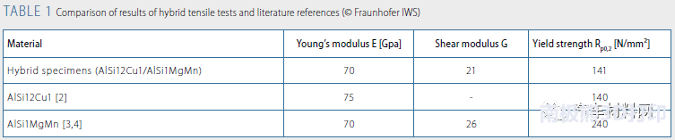 下表1展示了混合部件和單一材料的機(jī)械性能對(duì)比,雖然性能略低于單一材料的文獻(xiàn)參考值,但均符合汽車(chē)工業(yè)的要求。且在測(cè)試中,相關(guān)的連接區(qū)域沒(méi)有發(fā)生失效。
