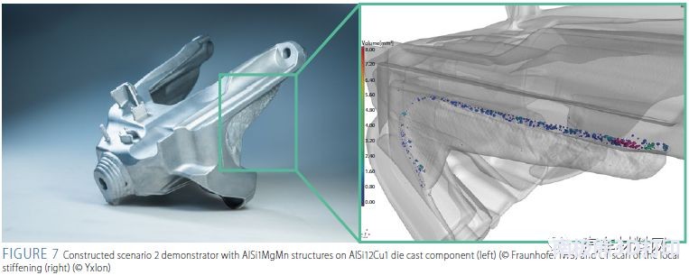基于該工藝,研究人員制造了一個(gè)發(fā)動(dòng)機(jī)支撐結(jié)構(gòu),如圖7(左)。由于奧迪這款產(chǎn)品已停產(chǎn),所以未能進(jìn)行真空鑄造。從圖7右側(cè)的CT掃描中可以看出,通過(guò)LPD生產(chǎn)的加強(qiáng)肋幾乎沒(méi)有孔隙。其僅在壓鑄和附加結(jié)構(gòu)之間的過(guò)渡區(qū)域中出現(xiàn)部分孔隙。目前該團(tuán)隊(duì)正在研究制造用于動(dòng)態(tài)/靜態(tài)力學(xué)性能以及耐腐蝕性測(cè)試的部件。