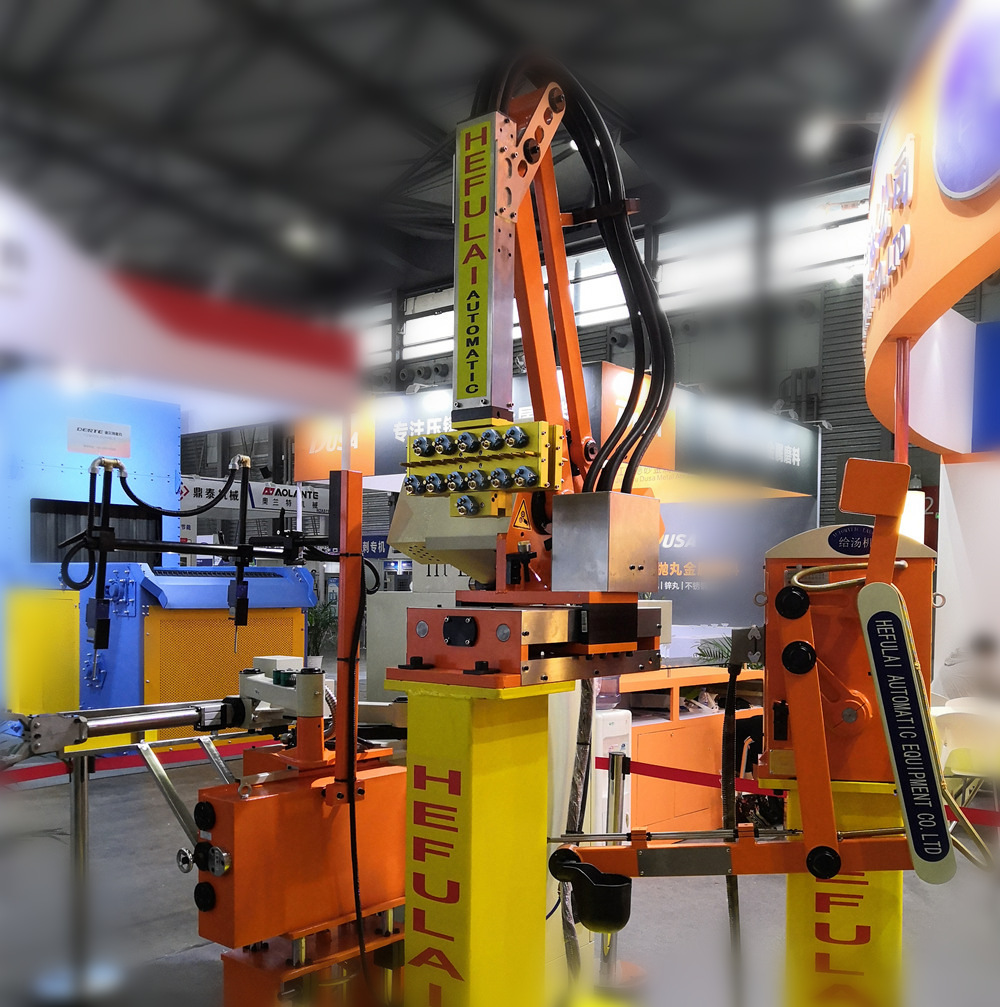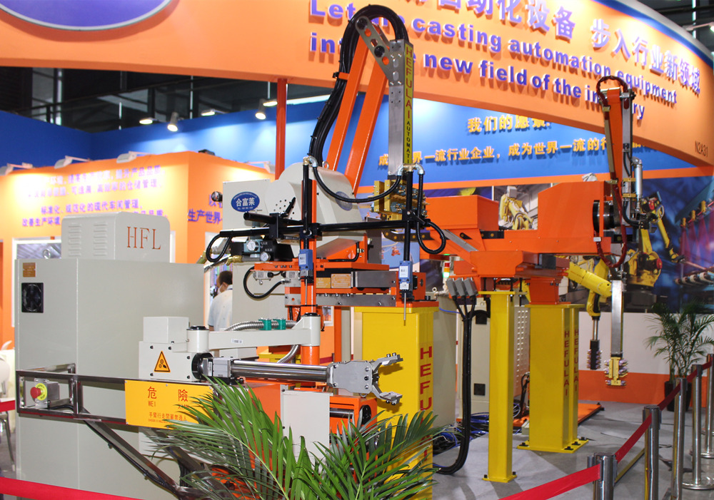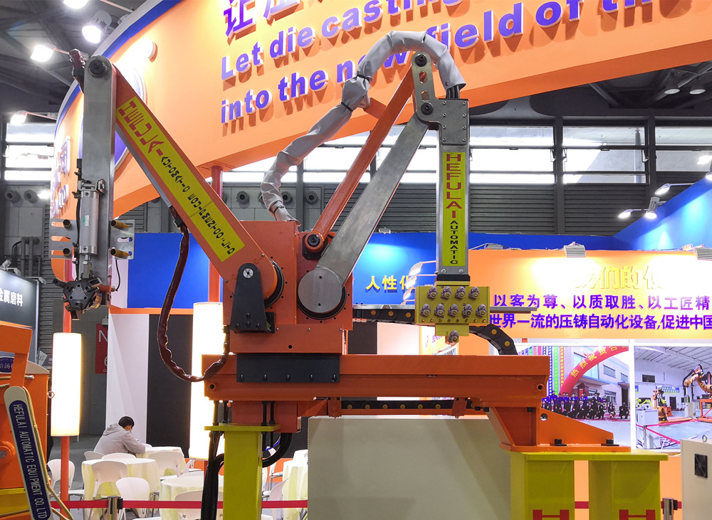 東莞合富萊機器人集成壓鑄島 據(jù)介紹,在機器人集成壓鑄島方面,東莞合富萊已完成從自主知識產(chǎn)權(quán)的控制系統(tǒng),到硬件部分,除機器人本體以外的中央控制柜、夾爪、制品檢出、底座、H320沃鈴模組、閥體控制箱、架臺等的開發(fā)和制造。同時,聯(lián)合用戶的應(yīng)用場景,開發(fā)了許多訂制化的壓鑄島解決方案,掌握了成熟的技術(shù)、工藝及應(yīng)用經(jīng)驗。公司已為汽車零部件、5G基站配件等壓鑄件生廠商,提供數(shù)量眾多的機器人集成壓鑄島生產(chǎn)線。 新型連桿噴取機器人首次亮相華東展會 值得一提的是,東莞合富萊此次展示的HFLREB系列連桿噴取機器人,為首次在國際壓鑄展上展示的產(chǎn)品。這款新產(chǎn)品是在噴取一體線性機器人基礎(chǔ)上進(jìn)行全面改進(jìn)的新機型,由于線性機器人導(dǎo)軌長期高溫、腐蝕氣體影響,導(dǎo)致導(dǎo)軌使用壽命短;同時安裝于頭板正上方,取出壓鑄件時,容易受脫模劑霧氣污染,為此該新機型引入傳統(tǒng)壓鑄“三手”的連桿結(jié)構(gòu)的優(yōu)勢,結(jié)合用戶實際生產(chǎn)的實踐并不斷改進(jìn)優(yōu)化,既保留了原噴取一體線性機器人的優(yōu)點,又成功解決了這一缺陷問題。