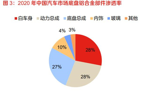 目前底盤輕量化的主要路徑是以鋁合金代替鋼鐵,汽車底盤鋁合金部件包括轉向節、副車架、制 動卡鉗、控制臂、輪轂、各種殼體等。據中國產業信息網數據,2020 年中國汽車市場中鋁合金轉 向節、副車架、制動卡鉗、控制臂的滲透率分別為 15%、8%、40%、5%,具有廣闊的提升空間。 據國際鋁業協會數據,鋁合金在動力系統的滲透率達 90%,汽車底盤與其相比仍是藍海市場。 國內眾多鋁合金精密壓鑄公司均在底盤輕量化領域有所布局,隨著汽車輕量化需求不斷增加,預計鋁合金部件將在底盤領域加速滲透,相關零部件公司有望從底盤輕量化趨勢中持續受益。 2.2 車身輕量化:熱成型鋼及輕量化工藝為主流途徑 汽車車身是整車重量占比最高的部分,也是輕量化潛力最大的領域,傳統汽車中以高強度鋼代替 普通鋼材能減重約 11%,采用鋁合金則能減重約 40%,輕量化材料減重效果顯著。鑒于車身強度 要求、輕量化材料價格及加工技術水平等問題,鋼材作為汽車車身主要材料的地位短時間內難以 撼動。 鋁合金材料在輕量化程度和耐腐蝕性等方面相較于鋼材優勢明顯,然而鋁合金在車身上的應用仍 面臨巨大的挑戰:(1)加工工藝復雜。目前鋼材加工工藝已非常成熟,而鋁合金車身的加工和 連接需要鋁電阻點焊、自沖鉚接、膠接連接、激光焊接等多種工藝,生產流程的復雜度和自動化 要求遠高于傳統鋼材車身。(2)制造成本高。首先是鋁合金本身的價格較高,車用鋁合金單價 約為每噸 1.5 萬,是鋼材料的近 3 倍,其次復雜的加工工藝使得鋁合金車身成本進一步提升。(3)維修成本高,由于鋁材延展性較差且維修工藝復雜,鋁合金車身維修通常需要全件更換,導致售 后維修費用大幅增加。據文燦股份公告,目前鋁合金車身結構件在燃油車的滲透率僅為 3%,在 純電動車的滲透率為 8%,隨著加工工藝改進及電動汽車減重需求持續提升,預計鋁合金等輕量 化材料在車身上的應用將不斷增加。 現階段使用熱成型鋼等超高強度鋼材及輕量化制造工藝是實現車身輕量化的主流途徑。熱成型鋼 是將鋼板加熱至 880-950℃后,在冷卻模具中進行熱沖壓成型及淬火處理,得到超高強度的沖壓 件。熱成型鋼材具有極高的材料強度,具有 1000 MPa 以上的屈服強度和 1300MPa 以上的抗拉 強度,是普通鋼材的 2 倍以上。目前主流的白車身由普鋼、高強度鋼、熱成型鋼等不同強度鋼材 復合連接而成,其中熱成型鋼通常應用于車身前后保險杠、AB 柱、中通道等重要安全結構件,能 夠以更低的厚度實現相同的安全性能,從而實現車身輕量化。除熱成型技術外,激光拼焊、液壓 成型等輕量化制造工藝也能夠在保證車身安全性的前提下減少鋼板厚度,達到車身輕量化目的。