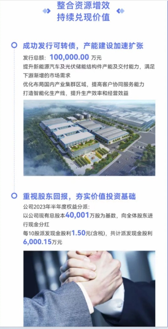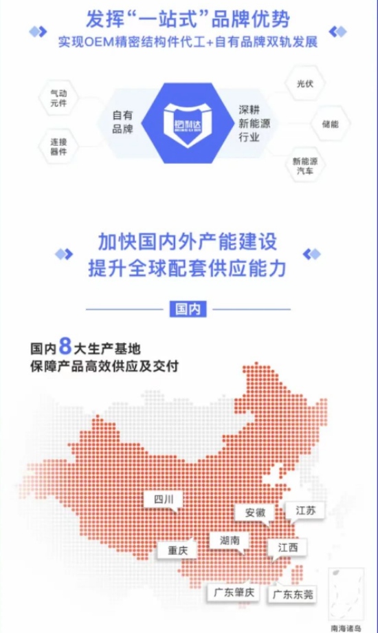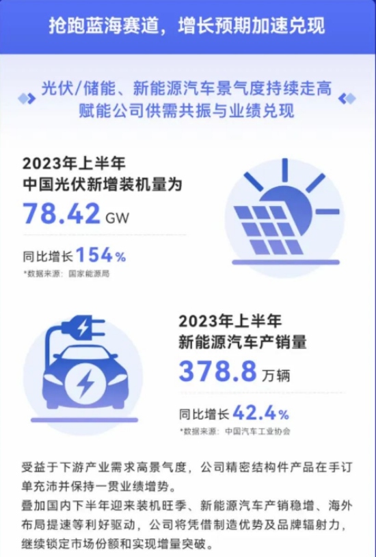 據(jù)了解,銘利達(dá)系專業(yè)從事精密結(jié)構(gòu)件及模具的設(shè)計、研發(fā)、生產(chǎn)及銷售,以產(chǎn)品研發(fā)、模具設(shè)計和工藝設(shè)計與創(chuàng)新為核心,以精密壓鑄、精密注塑、型材加工和五金沖壓技術(shù)為基礎(chǔ),為國內(nèi)外優(yōu)質(zhì)客戶提供多類型、一站式的精密結(jié)構(gòu)件產(chǎn)品。 銘利達(dá)表示,收益與下游產(chǎn)業(yè)高景氣度,公司精密結(jié)構(gòu)件產(chǎn)品在手訂單充沛并保持一貫業(yè)績增勢。疊加國內(nèi)下半年迎來裝機旺季、新能源汽車產(chǎn)銷穩(wěn)增、海外布局提速等利好驅(qū)動,公司憑借制造優(yōu)勢和品牌輻射力,繼續(xù)鎖定市場份額和實現(xiàn)增量突破。 據(jù)介紹,從涉及行業(yè)來看,公司產(chǎn)品的應(yīng)用領(lǐng)域主要包括光伏、儲能、安防、新能源汽車以及消費電子。其中,光伏、儲能和新能源汽車為清潔能源應(yīng)用領(lǐng)域,預(yù)期未來一段較長的周期都將保持較高的成長性和增長空間,同步將帶動結(jié)構(gòu)件行業(yè)領(lǐng)域的持續(xù)快速發(fā)展。國家能源局?jǐn)?shù)據(jù),2023年上半年,中國廣泛新增裝機量為78.42GW,同比增長154%。中國汽車工業(yè)協(xié)會數(shù)據(jù)顯示,上半年,新能源汽車產(chǎn)量378.8萬輛,同比增長42.4%。 另外,安防經(jīng)過多年的發(fā)展,目前已處于行業(yè)的成熟期,消費類電子,尤其如加熱不燃燒煙等新型消費品等應(yīng)用領(lǐng)域方興未艾,也處于行業(yè)快速發(fā)展階段。發(fā)揮一站式品牌優(yōu)勢,實現(xiàn)0EM精密結(jié)構(gòu)件代工+自有品牌雙軌發(fā)展。 在產(chǎn)能建設(shè)方面,目前,銘利達(dá)在國內(nèi)建成8達(dá)生產(chǎn)基地,分布在廣東東莞、肇慶,江西、湖南,重慶,四川,江蘇、安徽等地,保障產(chǎn)品高效供應(yīng)及交付。2023年加速布局海外生產(chǎn)基地,北美墨西哥和歐洲匈牙利基地推進投建。進一步穩(wěn)固海內(nèi)外客戶的合作粘性。