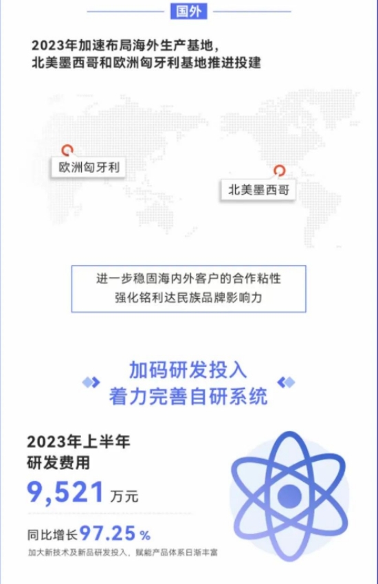 在研發(fā)投入方面,加碼研發(fā)投入,著力完善自研系統(tǒng)。銘利達(dá)表示,2023年上半年,研發(fā)費用9521萬元,同比增長97.25%。加大新技術(shù)及新產(chǎn)品研發(fā)投入,賦能產(chǎn)品體系日漸豐富。