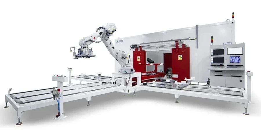 其中,針對大型一體化壓鑄車身件,蘇州偉杰科技推出雙機器人雙C型臂(DRDC)檢測系統。該設備擁有兩套獨立的上下料系統,工件可以從左邊進左邊出,或從右邊進右邊出;鉛房內兩臺機器人分別通過C型臂固定射線源和射線探測器,形成兩套檢測系統協同工作,大大縮短檢測節拍。目前,該設備的最大檢測尺寸為1600×1750×800mm的產品(具體以工件3D數模評估為準)。此外,內部工位檢測的同時還可以在外部工位進行上下料,大大縮短檢測周期,提高檢測效率。