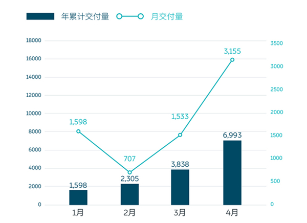![]() 5月6日,蔚來汽車官方發布銷量數據,4月,蔚來整體交付量達3155臺,同比增長180.7%,環比增長105.8%,連續兩月實現交付數環比翻番。蔚來在今年的累計交付量已達6993臺,有望半年破萬臺。自2018年6月開始交付以來,蔚來全品牌累計交付38906臺。