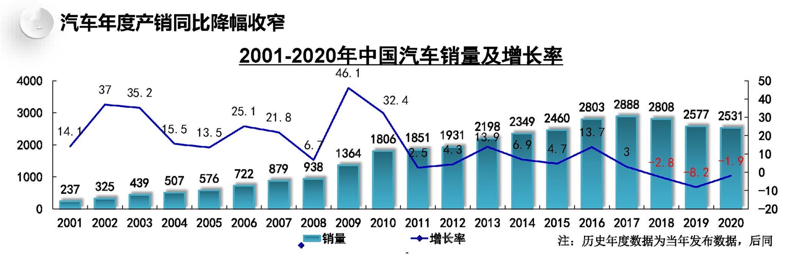從汽車行業發展趨勢來看,伴隨國民經濟穩定回升,消費需求還將加快恢復,加之中國汽車市場總體來看潛力依然巨大,因此判斷2020年或將是中國汽車市場的峰底年份,2021年將實現恢復性正增長,其中,汽車銷量有望超過2600萬輛,同比增長4%;新能源汽車有望達到180萬輛,同比增長40%。 |
