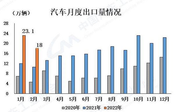 汽車出口同比繼續(xù)保持大幅增長 2月,汽車企業(yè)出口18萬輛,環(huán)比下降21.9%。同比增長60.8%,繼續(xù)保持大幅增長。1-2月,企業(yè)企業(yè)出口41.2萬輛,同比增長75%。