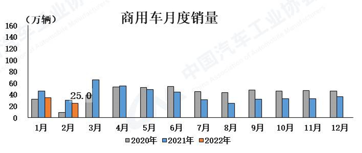 商用車同比降幅有所收窄 2月,商用車產(chǎn)銷分別完成27.9萬輛和25萬輛,環(huán)比分別下降19.2%和27.4%,同比分別下降18.3%和16.6%。1-2月,商用車產(chǎn)銷分別完成62.4萬輛和59.4萬輛,同比分別下降24%和21.7%。