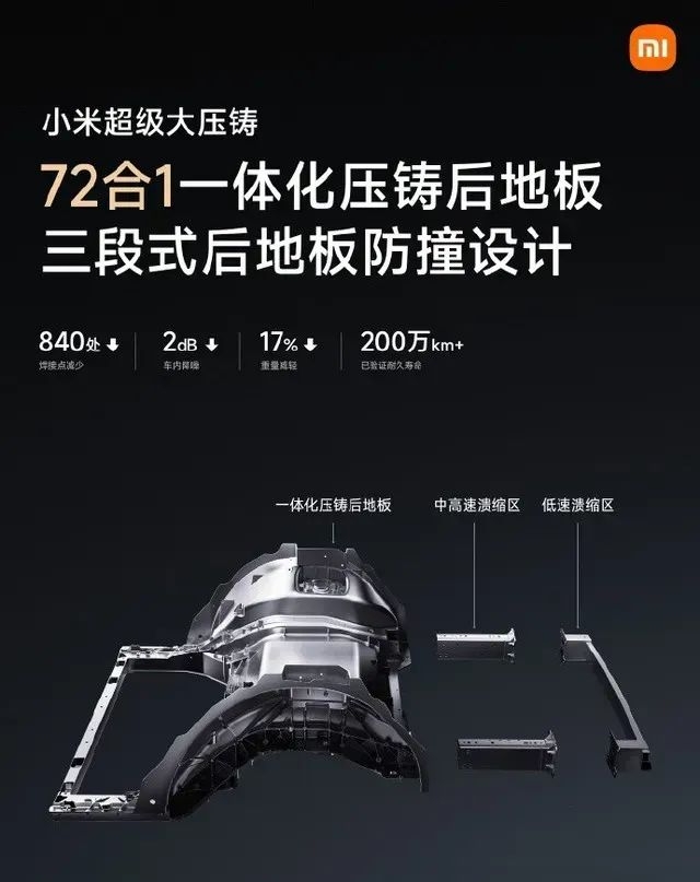 除此之外,小米自研高強高韌免熱處理環保壓鑄材料“泰坦合金”,已經運用于小米SU7 車型 “72 合一”一體化壓鑄后地板中,該車型配備三段式后地板,相比傳統壓鑄技術“焊接點減少 840 處、車內降噪能力提升 2dB、重量減輕 17%”,壽命 200 萬公里以上,并能夠實現較強的防撞能力。