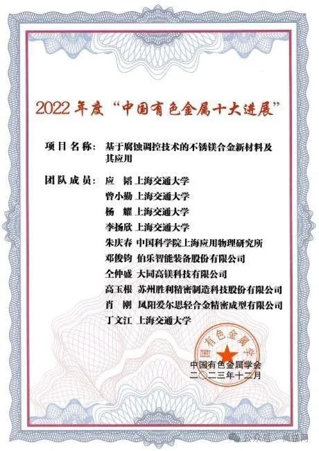 ![]() 采訪對(duì)象供圖(下同) 我國鎂資源豐富,產(chǎn)量占全世界80%,是我國為數(shù)不多具有自主可控話語權(quán)的戰(zhàn)略性金屬資源。鎂是目前可用的最輕的金屬結(jié)構(gòu)材料,密度比鋁合金小30%,只有鋼的1/5,鎂具有高比強(qiáng)度、高比剛度、優(yōu)異的減震、電磁屏蔽性能,易于回收等諸多優(yōu)點(diǎn),在汽車、高鐵、3C、通信、航空、航天、武器裝備等領(lǐng)域有著重要的輕量化應(yīng)用潛力。當(dāng)前世界各國高度重視鎂合金材料的發(fā)展。例如,歐盟將鎂列為30種關(guān)鍵基礎(chǔ)材料之一。但是,鎂合金化學(xué)性質(zhì)活潑、表面氧化層疏松多孔導(dǎo)致的耐蝕性差,已經(jīng)成為制約其大規(guī)模應(yīng)用的阿喀琉斯之踵。 上海交通大學(xué)丁文江院士、曾小勤教授領(lǐng)銜的上海鎂材料及應(yīng)用工程技術(shù)研究中心團(tuán)隊(duì),多年來一直在探索鎂合金新材料研發(fā)的無人區(qū),不斷突破鎂合金性能瓶頸,曾獲得“2020年國家技術(shù)發(fā)明一等獎(jiǎng)”、兩次獲得“中國有色金屬工業(yè)科學(xué)技術(shù)一等獎(jiǎng)”等多項(xiàng)國家級(jí)、省部級(jí)大獎(jiǎng)。近年來,團(tuán)隊(duì)將人工智能高通量計(jì)算與材料基因工程技術(shù)相融合,提出了“降低電位差,抑制陰陽極”的不銹鎂設(shè)計(jì)模型,實(shí)現(xiàn)了低電位差合金相高通量篩選和不銹鎂成分優(yōu)化設(shè)計(jì),相較于傳統(tǒng)基于經(jīng)驗(yàn)試錯(cuò)的開發(fā)方法,研制周期和費(fèi)用減少了五分之四。