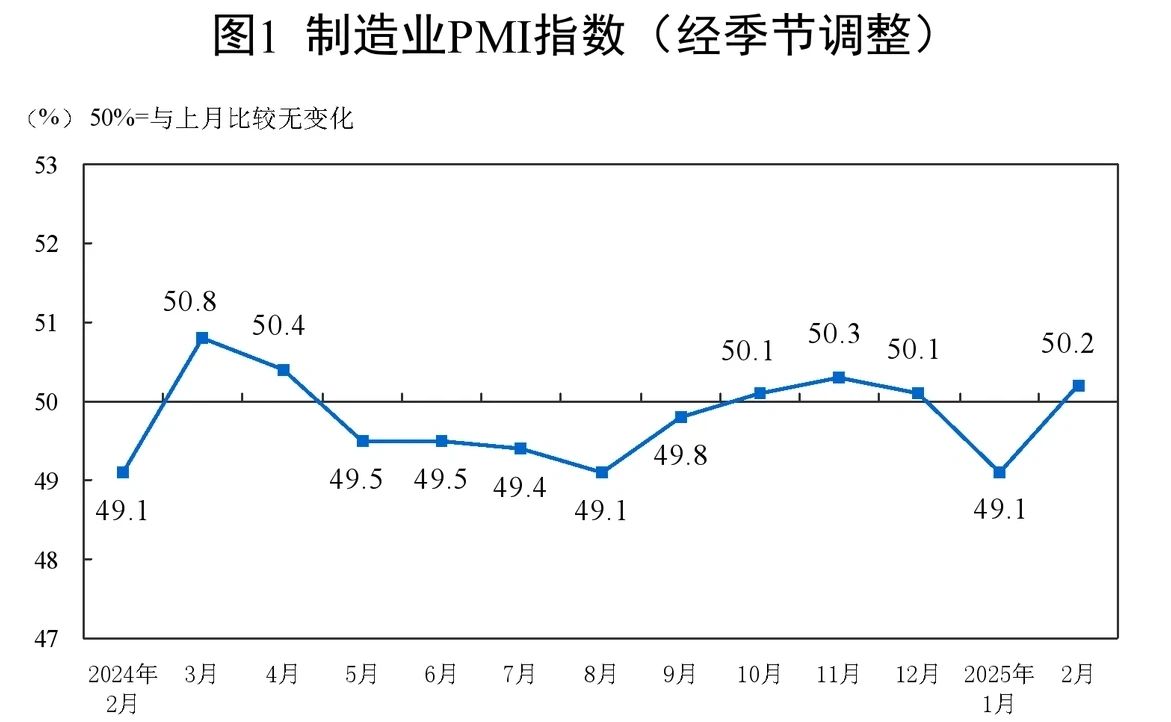 2月我國制造業(yè)PMI為50.2% 國家統(tǒng)計局發(fā)布數(shù)據(jù),2025年2月,中國制造業(yè)采購經(jīng)理指數(shù)(PMI)為50.2%,比上月上升1.1個百分點,制造業(yè)景氣水平明顯回升。2月,綜合PMI產(chǎn)出指數(shù)為51.1%,比上月上升1.0個百分點,表明我國經(jīng)濟景氣水平總體回升。