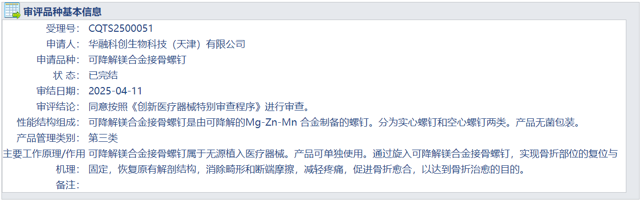 高鎂輕強鋁大規格鑄錠,圖源:中國有研 科創醫療集團可降解鎂合金接骨螺釘創新批件獲批 來自科創醫療集團的消息,4月11日,科創醫療集團旗下華融科創生物科技(天津)有限公司自主研發的可降解鎂合金接骨螺釘,成功獲得國家藥品監督管理局(NMPA)頒發的醫療器械創新批件。其核心原材料配方已獲中國及美國 PCT 發明專利。