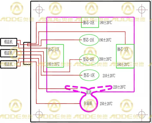 ![]() 模溫控制分區(qū)預(yù)熱示意圖 在壓鑄生產(chǎn)工藝中,不平均或不適當(dāng)?shù)哪>邷囟冉?jīng)常會(huì)導(dǎo)致鑄件尺寸不穩(wěn)定。在生產(chǎn)過程中頂出鑄件變形,產(chǎn)生熱壓力、黏模、表面凹陷、內(nèi)縮孔及熱泡等缺陷。模溫差異較大時(shí),對生產(chǎn)周期中的變數(shù),如填充時(shí)間、冷卻時(shí)間及噴涂時(shí)間等都會(huì)產(chǎn)生不同程度的影響。另外,模具的壽命亦會(huì)因受到過冷過熱的沖擊而導(dǎo)至昂貴鋼材產(chǎn)生熱裂等問題。