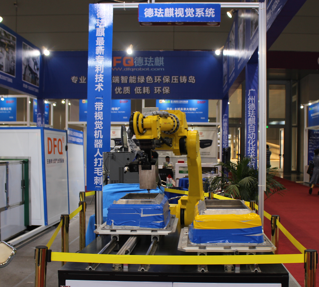 設(shè)備外觀結(jié)構(gòu)設(shè)計(jì),科學(xué)合理,參考國內(nèi)外企業(yè)的優(yōu)點(diǎn),維護(hù)簡單方便,罩殼采用一塊一塊鋁板拼湊,可獨(dú)立分拆,這樣的好處就是有一塊板壞了,只換故障的這塊,不用整體更換,節(jié)省了成本。同時,因內(nèi)部結(jié)構(gòu)沒有死角,在廢氣及少量廢液進(jìn)入吸入煙塵罩里面,不會有清理困難,而且外部沒有拉管,也減少了安全隱患。整機(jī)設(shè)計(jì)更加科學(xué)合理。 據(jù)公司技術(shù)部負(fù)責(zé)人表示:“相對于國外品牌,德琺麒壓鑄單元廢氣處理設(shè)備使用簡單,廢氣處理效果好,維護(hù)成本低,性價比高,廣受用戶的認(rèn)可。這也是國內(nèi)許多壓鑄企業(yè)選擇德法麒設(shè)備的原因。目前,廣東鴻圖、武漢鴻圖、銘利達(dá)、榮嘉等知名壓鑄企業(yè)都使用了我們的設(shè)備,使用效果良好。” 機(jī)器人去毛刺激光視覺系統(tǒng) 據(jù)介紹,德琺麒機(jī)器人去毛刺激光視覺系統(tǒng)由公司自主研發(fā),為首次在展會上展示。該系統(tǒng)是由一臺機(jī)器人、激光視覺定位系統(tǒng)、浮動雙刀頭組成。通過視覺定位,引導(dǎo)機(jī)器人自動矯正,可自動完成壓鑄件的識別及去毛刺的過程,節(jié)省了人工成本。該系統(tǒng)主要應(yīng)用于汽車零部件制造行業(yè)。