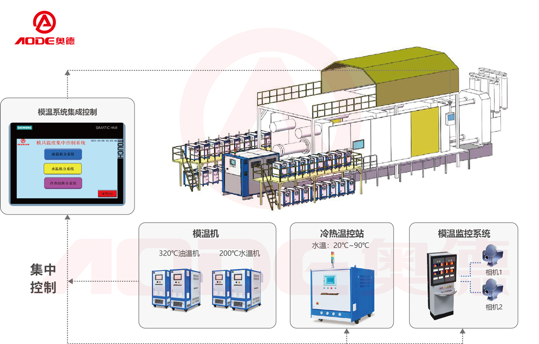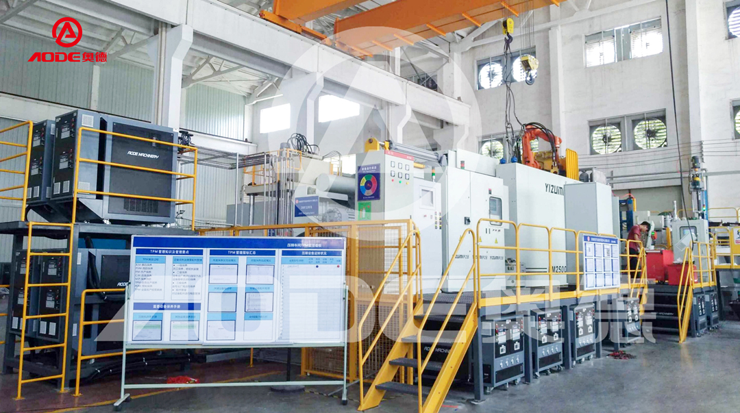 ![]() 結(jié)構(gòu)件在車身中的應(yīng)用 奧德于2020年初應(yīng)客戶需求開發(fā)出大型汽車結(jié)構(gòu)件一體化壓鑄智能溫控系統(tǒng)。經(jīng)過一年多的市場推廣至今,奧德已為知名新能源汽車企業(yè)交付數(shù)套并投入使用。下文為大家分享大型汽車結(jié)構(gòu)件一體化壓鑄智能溫控系統(tǒng)的原理及解決方案。 隨著零排放、輕量化成為全球汽車工業(yè)的發(fā)展趨勢,同時也是節(jié)能減排的重要途徑,加上中國新能源汽車市場的迅猛發(fā)展,大型汽車壓鑄結(jié)構(gòu)件對模溫平衡的需求顯而易見。汽車輕量化主要分為材質(zhì)輕量化和結(jié)構(gòu)輕量化,考慮到成本、生產(chǎn)難度等因素,鋁合金和結(jié)構(gòu)件壓鑄是首選材料和最優(yōu)工藝。當(dāng)汽車結(jié)構(gòu)件改用大型輕合金薄壁鑄件時,一方面可有效實現(xiàn)輕量化;另一方面,由于結(jié)構(gòu)高度集成、一體成形,從而減少了成型和連接環(huán)節(jié),精簡了工藝,進(jìn)而降低了成本。 大型汽車結(jié)構(gòu)件一體化壓鑄過程中的溫度控制是關(guān)鍵環(huán)節(jié),溫度控制包括模具、壓室與沖頭、分流錐與澆口套等溫度平衡控制。模溫控制系統(tǒng)是通過模溫機(jī)單元連續(xù)工作控制動定模、模肉和模架的溫度,利用常壓冷卻裝置的連續(xù)工作控制壓室、沖頭分流錐和澆口套的溫度,采用高壓模冷機(jī)斷續(xù)工作控制模芯、模塊溫度,通過細(xì)芯點冷機(jī)斷續(xù)工作控制型芯銷、小鑲塊溫度。 其中,模溫機(jī)是用來調(diào)節(jié)模具溫度的平衡,可以升溫也可以降溫。模溫機(jī)利用高熱傳性的導(dǎo)熱媒體,以便在很短的時間內(nèi)將模具內(nèi)溫度提高或者將多余的熱送走。在設(shè)定好熱平衡溫度后,能將其溫度自動控制在極小的誤差之內(nèi),且能維持定值。利用模溫機(jī)調(diào)節(jié)模具的平衡溫度,可以預(yù)熱模具的生產(chǎn)溫度,優(yōu)化循環(huán)時間,更好地促進(jìn)產(chǎn)品定型,減少開機(jī)時保證絕大部分的次品率。